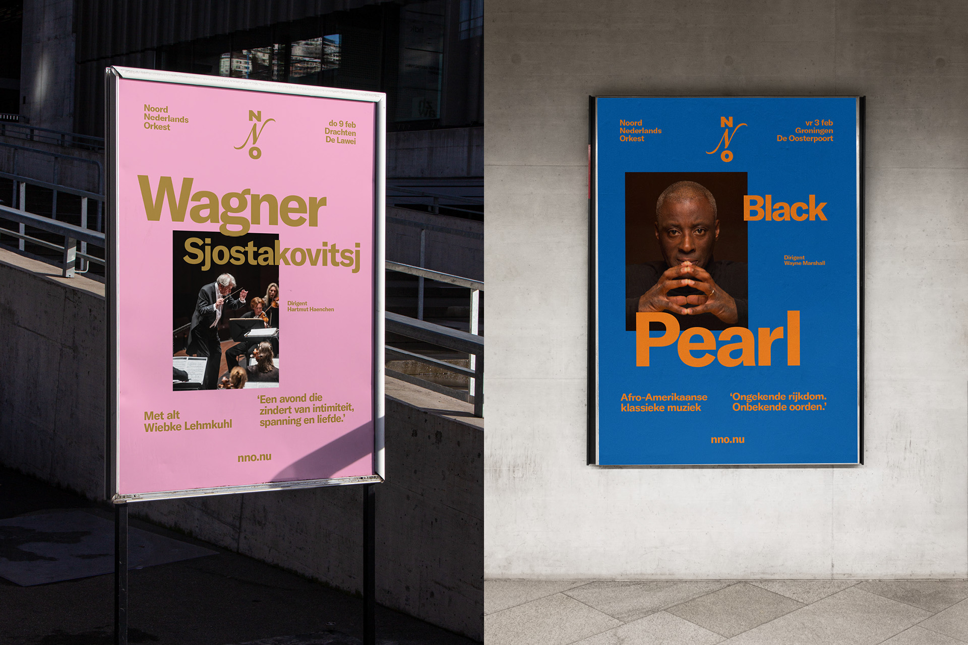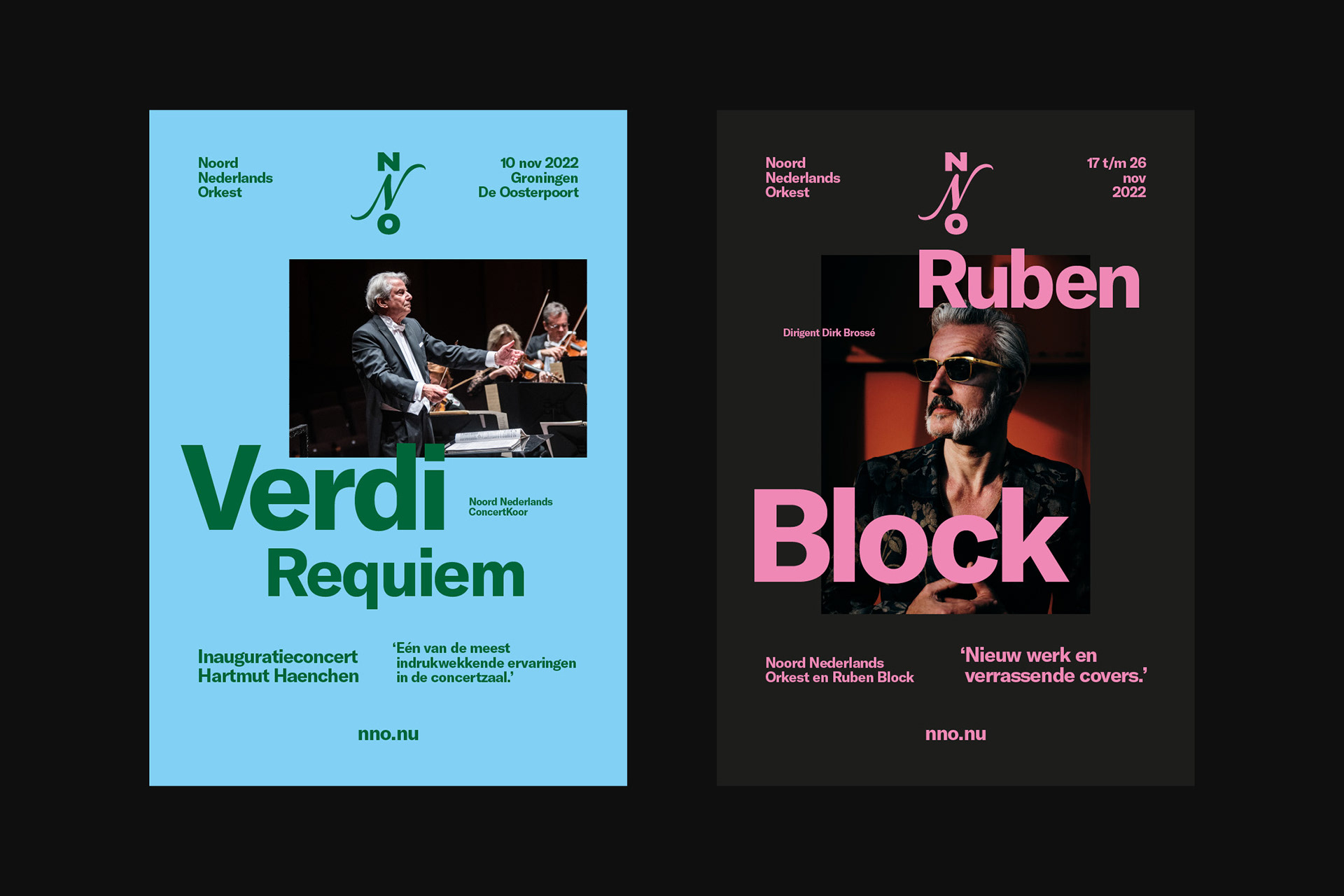 Visual identity and poster design for the North Netherlands Symphony Orchestra (NNO). A leading, forward-thinking symphony orchestra based in Groningen. The orchestra performs at the highest level both exciting new programmes, as well as traditional symphonic repertoire.